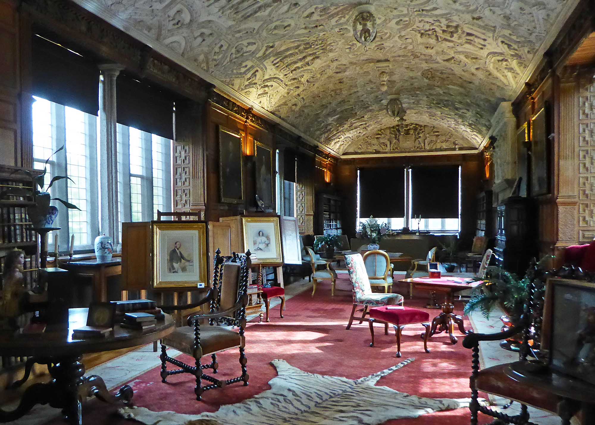 We found the the Long Gallery, which survived the fire, to be of most interest with its ornate plastered ceiling, probably dating back to 1642 and depicting Old Testament scenes, and important collection of books some from before 1500.
